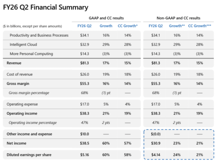 当地时间1月28日,微软发布了截至2025年12月31日的第二财季业绩报告。其营收达813亿美元,同比增长17%;按美国通用会计准则(GAAP)计算的净利润为385亿美元,同比大增60%;按Non-GAAP计算,净利则为309亿美元,同比增长23%。非美国通用会计准则结果剔除了微软对OpenAI投资的影响。