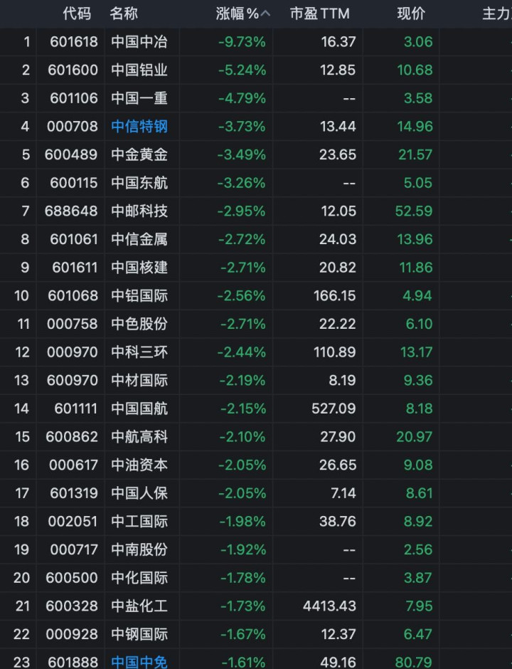 别说港股了,A股那些“中字头”也没几个扛住的。从中国铝业到中国人保,从中远海发到中航沈飞,跌幅普遍在1.5%到9%之间,名单一拉一大串。这些过去被视为“压舱石”的企业,如今却成了拖累大盘的包袱。